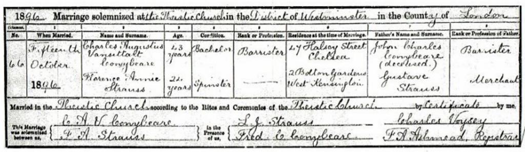 View Original: | Marriage certificate of Florence Annie Strauss and Charles Augustus Vansittart Conybeare.PNG (1098x318) | |||