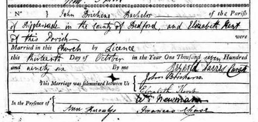 | Keywords: Marriage Certificate John Bricheno 1796.jpg en Marriage certificate of John Bricheno and Elizabeth Kent in 1796 He was the owner of Shortmead House Biggleswade Register of Biggleswade Church Bedfordshire 1796 author 1796 Biggleswade PD-old-100-1923 |
