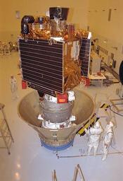 | Keywords: mars global surveyor marsglobalsurveyor delta ii deltaii Jet Propulsion Laboratory (JPL) workers in the Payload Hazardous Servicing Facility (PHSF) prepare the Mars Global Surveyor spacecraft for transfer to the launch pad by placing it in a protective canister. The Surveyor spacecraft (upper) is already mated to its solid propellant upper stage booster (lower), which is actually the third stage of the Delta II expendable launch vehicle that propelled the spacecraft on its interplanetary journey to the Red Planet. At Launch Pad 17A on Cape Canaveral Air Station, the spacecraft and booster assembly were stacked atop the Delta vehicle. The Surveyor lifted off on November 7, 1996 and arrived at Mars on September 12, 1997. Image #: 9613634 Date: October 21, 1996 Jet Propulsion Laboratory (JPL) workers in the Payload Hazardous Servicing Facility (PHSF) prepare the Mars Global Surveyor spacecraft for transfer to the launch pad by placing it in a protective canister. The Surveyor spacecraft (upper) is already mated to its solid propellant upper stage booster (lower), which is actually the third stage of the Delta II expendable launch vehicle that propelled the spacecraft on its interplanetary journey to the Red Planet. At Launch Pad 17A on Cape Canaveral Air Station, the spacecraft and booster assembly were stacked atop the Delta vehicle. The Surveyor lifted off on November 7, 1996 and arrived at Mars on September 12, 1997. Image #: 9613634 Date: October 21, 1996 |