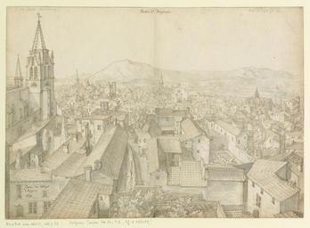 | Keywords: Martellange 1617 Avignon Vin.jpg View looking east over Avignon probably from the roof of the Livrée de Ceccano The church in the foreground on the left is the Église Saint-Didier Pen with brown ink and an Indian ink wash plume et encre brune lavis d'encre de Chine Institution Bibliothèque nationale de France Département Estampes et photographie RESERVE UB-9-BOITE FT 4 cm 38 8 54 3 within interior border ark /12148/btv1b69375774 The top left of a plan draw by Martellange available from http //gallica bnf fr/ark /12148/btv1b84483688 Gallica shows the buildings that are visible in the left foreground of this view The large church in the centre is the now demolished Église Saint-François of the couvent des Cordeliers The church can also be seen in the Atlas van Loon File Avenio vulgo Avignon Atlas van Loon jpg dated 1663 by apparently based on data from earlier in the century - the Jesuit novitiate is shown but not the Jesuit college chapel - Musée Lapidaire In the Atlas the St Didier church is labelled as 30 red roof and hard to spot and the large St Francois church as 21 The Livrée de Ceccano is probably the long building viewed almost end on one block back from the main north-south street Rue St Marc now Rue de la République The BNF catalogue http //catalogue bnf fr/ark /12148/cb403334620 has Sur ce dessin à dr du collège des Jésuites figure une église dont la façade rappelle celle de l'ancienne église Saint-François du couvent des Cordeliers Mais son emplacement semble erroné <br> It is unclear why the cataloguer considered the position erroneous The surviving tower of the Chapelle des Cordelier lies to the east of the Livrée de Ceccano - apparently compatible with the view depicted by Martellange PD-art-100 Other versions Étienne Martellange Drawings and engravings of Avignon |