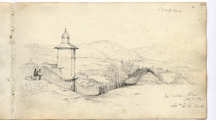 | Keywords: Martens, San Carlos, Chiloé Lat, 41 51' South (image 37, page 24r).jpg Drawings and watercolors by Conard Martens from the second voyage of HMS Beagle Sketchbook I with titles and numbers as in Cambridge Digital Library which has more info possibly better zooming option; upper and lower margins cropped; not rotated Cambridge Digital Library http //cudl lib cam ac uk/view/MS-ADD-07984/1 1834 1835 Conrad Martens 1801-1878 PD-scan Originally distributed as CC-BY-NC 3 0 but PD tag is applicable Beagle sketchbook I Chiloé Archipelago Ancud |