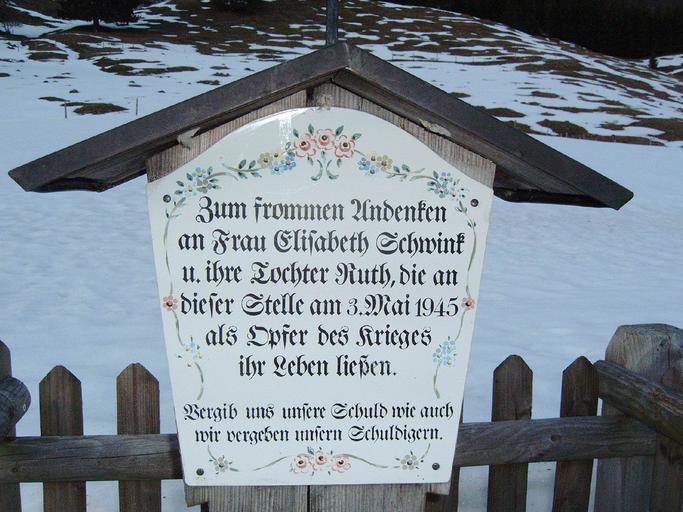 | Keywords: Marterl bei Sachenbach zur Erinnerung an den Tod von Elisabeth und Ruth Schwink.jpg Marterl bei Sachenbach zur Erinnerung an den Tod von Elisabeth und Ruth Schwink am 3 Mai 1945 own <br /> de wikipedia Sebastian Wallroth CommonsHelper <br/> original text 1 selbst fotografiert 2002-10 JostGudelius JostGudehus original upload log page de wikipedia 030545Sachenbach jpg 2009-10-14 15 27 JostGudelius 1600×1200× 434000 bytes <nowiki> Andere Versionen </nowiki> ImageNote 1 400 442 698 628 1600 1200 2 <poem>Zum frommen Andenken an Frau Elisabeth Schwink u ihre Tochter Ruth die an dieser Stelle am 3 Mai 1945 als Opfer des Krieges ihr Leben ließen Vergib uns unsere Schuld wie auch wir vergeben unseren Schuldigern </poem> ImageNoteEnd 1 Sachenbach |
