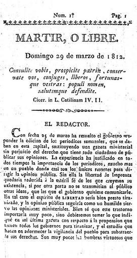 | Keywords: Martir o Libre - Primer número - 1812.jpg en Front page of Argentine patriot newspaper Martir o Libre directed by Bernardo de Monteagudo during the Independence Revolution of Argentina es Primera plana del diario patriota argentino Martir o Libre dirigido por Bernardo de Monteagudo durante la Revolución por la Independencia de Argentina Martir o Libre 1812 Bernardo de Monteagudo Buenos Aires Biblioteca Nacional Bernardo de Monteagudo 1812 PD-old-100 Scanned Spanish texts Newspapers of Buenos Aires 1812 newspapers |