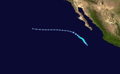 | Keywords: Marty 2009 track.png Track map of Tropical Storm Marty of the 2009 Pacific hurricane season The points show the location of the storm at 6-hour intervals The colour represents the storm's maximum sustained wind speeds as classified in the Saffir-Simpson Hurricane Scale see below and the shape of the data points represent the nature of the storm according to the legend below User Nilfanion/Tc/T Created by Cyclonebiskit using Wikipedia WikiProject Tropical cyclones/Tracks The background image is from NASA Tracking data switch source from the National Hurricane Center <sup>http //www nhc noaa gov/pastall shtml</sup> from the Central Pacific Hurricane Center <sup>http //www prh noaa gov/cphc/summaries/</sup> from the Joint Typhoon Warning Center <sup>https //metocph nmci navy mil/jtwc/best_tracks/</sup> from the Japan Meteorological Agency <sup>http //www jma go jp/jma/jma-eng/jma-center/rsmc-hp-pub-eg/besttrack html</sup> from the National Hurricane Center <sup>http //www nhc noaa gov/pastall shtml and the Central Pacific Hurricane Center http //www prh noaa gov/cphc/summaries/</sup> from the Central Pacific Hurricane Center <sup>http //www prh noaa gov/cphc/summaries/ and the Joint Typhoon Warning Center https //metocph nmci navy mil/jtwc/best_tracks/</sup> from the w National Hurricane Center <sup>http //www nhc noaa gov/pastall shtml</sup> or the Joint Typhoon Warning Center <sup>https //metocph nmci navy mil/jtwc/best_tracks/</sup> 2009-09-20 Cyclonebiskit Tropical Storm Marty 2009 2009 Pacific hurricane season track maps |
