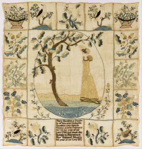 | Keywords: Mary Hamilton, American - Sampler - Google Art Project.jpg American 6825670 Mary Hamilton /collection/cooper-hewitt-national-design-museum/artwork/sampler-mary-hamilton-american/6839755/ 146577 Mary Hamilton American /artist/mary-hamilton/12696362/ 12696362 /collection/cooper-hewitt-national-design-museum/ Cooper-Hewitt National Design Museum 3644669 http //www cooperhewitt org/ /collection/cooper-hewitt-national-design-museum/artwork/sampler-mary-hamilton-american/6839755/ 1812 1812 Medium silk and metal thread embroidery on linen foundationTechnique embroidered in satin cross running stem and rococo stitches with figure eight looping on plain weave foundation By 1941 Mrs Henry E Coe Eva Johnston Coe 1941 - 1970 Emily Coe Stowell1970 Cooper-Hewitt Museum 6839755 False 1812 1970-28-17 http //collection cooperhewitt org/view/objects/asitem/id/146577 Bequest of Emily Coe Stowell from the Coe Collection Sampler 1810 1820 1812 False 0 958984375 Object sampler-mary-hamilton-american Sampler s Betty Ring Girlhood Embroidery American Samplers Pictorial Needlework 1650- 1850 Vol 2 New York Alfred A Knopf 1993 423 fig 469 Ethel Stanwood Bolton and Eva Johnston Coe American Samplers Boston The Massachusetts Society of the Colonial Dames of America 1921 167 Plate XLVII H x W 44 5 x 41 9 cm 17 1/2 x 16 1/2 in Mary Hamilton a Daughter of John and Catherine Hamilton was born in County Antrim February the 1 in the year of our Lord 1794 and made this Sampler in Maytown in Miss Welchens School in the year of our Lord 1812 Medium silk and metal thread embroidery on linen foundationTechnique embroidered in satin cross running stem and rococo stitches with figure eight looping on plain weave foundation By 1941 Mrs Henry E Coe Eva Johnston Coe 1941 - 1970 Emily Coe Stowell1970 Cooper-Hewitt Museum special url_id ogGC6VVQz4qyfA PD-old-100-1923 Google Art Project works by Mary Hamilton Textiles in the Cooper “Hewitt Smithsonian Design Museum 1810s samplers Google Art Project works in Cooper-Hewitt Smithsonian Design Museum 1812 works |