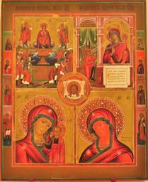 | Keywords: Maryhill Museum - Quadripartite icon of the Mother of God (late 19th century Russian icon) 01.jpg en Quadripartite icon of the Mother of God Egg tempera and gold leaf on wood panel Maryhill Museum of Art Maryhill Washington Four images of the Mother of God surrounding the Mandylion with ranks of saints at left and right Photo by Joe Mabel century 19 Unknown Russian PD-old-70 Maryhill Museum of Art 19th-century icons of Russia Multiple-images marian icons | ||||