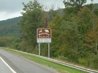 | Keywords: Maryland wildlife sign.JPG en Maryland wildlife Watch for it Stay alert A road sign along Interstate 68 in Maryland warning drivers of possible wildlife in the area Own ErgoSum88 2006-09-19 Interstate 68 in Maryland Road signs in Maryland Stay alert signs |