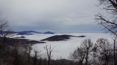 Keywords: Nature Mountain Trail National Park Trekking Hiking Skyline USA Hike Camping Campground Shenandoah Valley Sky Hawk hoarfrost Marys Rock Winter Fog