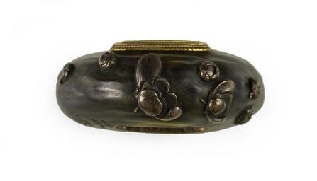 | Keywords: Masaharu - Kurikata with Plum Blossoms - Walters 51915 - Top.jpg Plum blossoms and buds are scattered across the kurikata as though they were blowing in the wind Plums blossoms are the first flowers to bloom after winter and are associated with early spring century 19 Edo shibuichi gold cm 3 4 accession number 51 915 14300 William T / Henry Walters Collection Baltimore date and mode of acquisition unknown Walters Art Museum Henry Walters Acquired by William T or Henry Walters Signature Masaharu place of origin Japan Walters Art Museum license Tosogu Japanese sword fittings in the Walters Art Museum Media contributed by the Walters Art Museum needs category review Masaharu |
