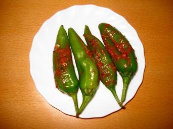 Keywords: Masala filled Green Chillies.JPG en Green chiilies filled with Achar Gosht Masala own Miansari66 Cc-zero Cuisine of Punjab India made by User Miansari66 Cuisine of Pakistan