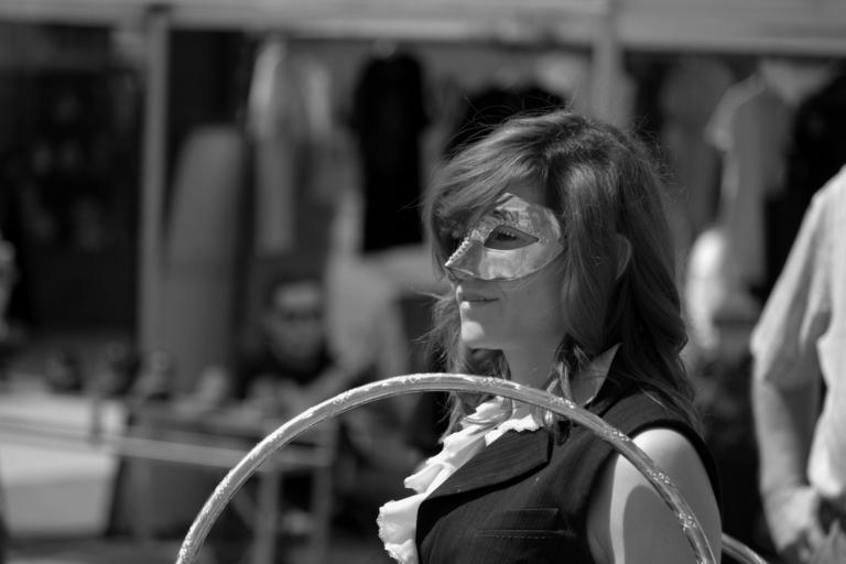 Keywords: masquerade blackandwhite black white monochrome street streetphotography lady woman girl female summer canada britishcolumbia bc okanagan kelowna blockparty outdoor