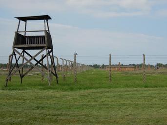 Keywords: massacre auschwitcz birkenau jewish death world war concentration camp house building houses old old building polish the prisoner jailer tower barbed wire