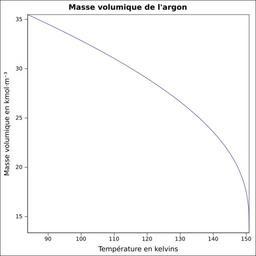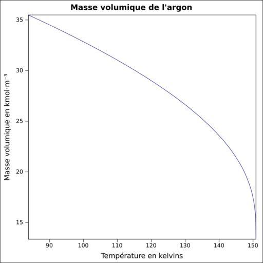 | Keywords: Masse volumique argon.svg fr Masse volumique calculée d'après <br/> Robert H Perry et Donald W Green Perry's Chemical Engineers' Handbook McGraw-Hill USA 1997 7e éd 2400 p ISBN 0-07-049841-5 p 2-94 own Epop 2010-06-27 Created with Gnumeric Density curves |