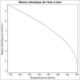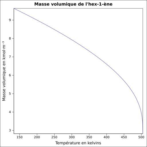 | Keywords: Masse volumique hex-1-ène.svg fr Masse volumique calculée d'après <br/> Robert H Perry et Donald W Green Perry's Chemical Engineers' Handbook McGraw-Hill USA 1997 7e éd 2400 p ISBN 0-07-049841-5 p 2-94 own Epop 2010-06-27 Created with Gnumeric Density curves |