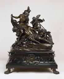 | Keywords: Massimiliano Soldani Benzi - Adonis Mourned by Venus and Cupids - Walters 54677 - Profile.jpg In this subject taken from ancient Greco-Roman mythology the beautiful hunter Adonis mortally wounded by a wild boar is mourned by his lover Venus goddess of love The tragedy is rendered with great delicacy and concentrates on the intimate moment of the last farewell Heightened emotion is imaginatively conveyed by the turbulence of the fluttering drapery and the inherent instability of the angle at which the body rests Superb craftsmanship in the final chasing of the surface creates rich textures and details The composition often parallels with the artist's Dead Christ Mourned by the Virgin Walters 54 1066 Soldani who was employed by the Medici court in Florence often designed elaborate bases for his works This exceptional example features detailing with a hunting motif and an inscription in Latin reading Through love I may resurrect alluding to the transformation of the blood of the dying Adonis into red anemones ca 1715 bronze with ebony wood base cm 47 accession number 54 677 19261 Liddell family Ravensworth Castle Durham Albert 4th Earl Grey date and mode of acquisition unknown Jacques Seligmann New York date and mode of acquisition unknown Henry Walters Baltimore date and mode of acquisition unknown Walters Art Museum Henry Walters Acquired by Henry Walters Transcription AMORE RESURGAM Highlights from the Collection The Walters Art Gallery Baltimore 1998-2001 place of origin Florence Italy Walters Art Museum license Baroque sculpture in the Walters Art Museum Massimiliano Soldani Benzi Media contributed by the Walters Art Museum needs category review Cupid with Venus and Adonis |