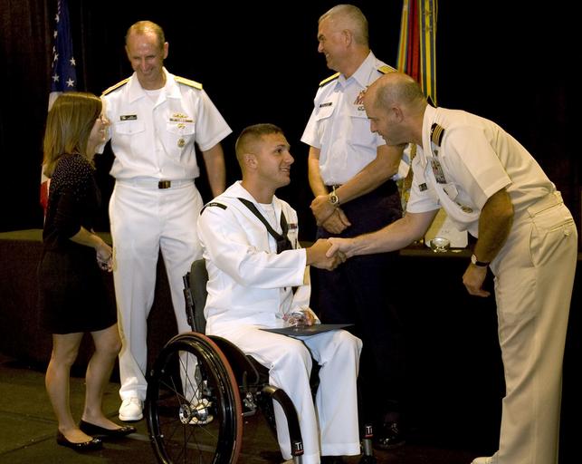 | Keywords: Master-at-Arms 3rd Class Nathan R. DeWalt is congratulated by Capt. Oakley Key Watkins.jpg  T3 vertebra Since his accident DeWalt competed in the Warrior Games and has begun distance cycling Safe Harbor is the Navy's lead organization for coordinating non-medical care of seriously wounded ill and injured Sailors Coast Guardsmen and their families U S Navy photo by Mass Communications Specialist 2nd Class Jonathan W Hutto Sr /Released 2010-09-30 14 32 39 https //www flickr com/photos/usnavy/5839682287/ Official U S Navy Page other versions PD-USGov United States Navy |
