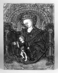 | Keywords: Master of the Orléans Triptych - The Virgin and Child - Walters 44126.jpg The Virgin turned three-quarters to the left stands in a sort of balcony or loggia only the upper half of her figure is visible over a parapet She wears a violet robe and blue mantle; her crowned head is surrounded by a nimbus Perched on her extended right hand is a green parrot which pecks at the right forefinger of the Child The Child clad in a green tunic open in front and exposing the lower half of his body stands on a fold of the Virgin's mantle spread upon the parapet The composition is framed between two columns with rings at the middle of their shafts crocketed capitals and fantastic bases which support a semi-circular arch lined with a double row of cusps and with crockets Through the arch behind a purple cloth of honor edged with paillettes of enamel opens a chapel its blue groin-vaults studded with stars The composition is based on an engraving by Martin Schongauer in which the Virgin turns the page of a book with her right hand while the Child holds the parrot on his left hand ca 1500 technique painted enamel copper cm 16 4 12 4 accession number 44 126 16114 Seligmann Brothers Paris date and mode of acquisition unknown Henry Walters city Baltimore Walters Art Museum Henry Walters Acquired by Henry Walters 1906 place of origin Limoges France Walters Art Museum license Limoges painted enamels in the Walters Art Museum Master of the Orléans Triptych Madonna and Child Media contributed by the Walters Art Museum needs artist update Painted enamel art in the Walters Art Museum |
