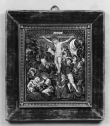 | Keywords: Master of the Passion - The Crucifixion - Walters 44204.jpg Christ is dead on a tau-cross with the titulus INRI At the left St John and one of the Marys assist the swooning Virgin Another holy woman stands in adoration of Christ On the right Mary Magdalene kneels and embraces the shaft of the cross The Centurion lifting his left arm in a contrapposto gesture to bear witness that Christ is truly the son of God is represented as a youth with a feathered cap a short-sleeved doublet slashed breeches and round-toed shoes Nearby an elderly helmeted man bearing a shield adorned with a cusped mask carries a lance over his right shoulder Beyond is another youth wearing a scroll-embroidered doublet and slashed breeches and a group of soldiers with lances and a swelling banner In the background are clusters of trees a hillock and the city of Jerusalem The sky is studded with stars ca 1530 1535 Renaissance technique painted enamel copper cm 12 5 10 6 accession number 44 204 36045 Henri Daguerre Paris date and mode of acquisition unknown Henry Walters city Baltimore Walters Art Museum Henry Walters Acquired by Henry Walters 1930 place of origin Limoges France Walters Art Museum license Limoges painted enamels in the Walters Art Museum Master of the Passion Media contributed by the Walters Art Museum needs category review Painted enamel art in the Walters Art Museum |