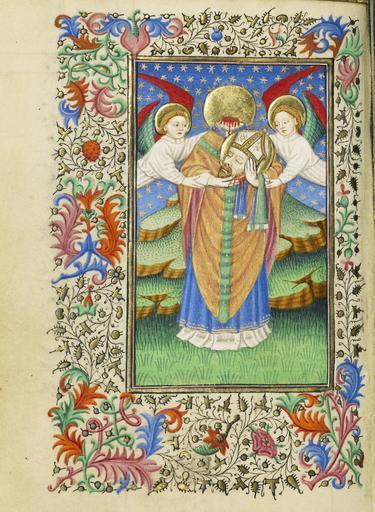 | Keywords: Master of Sir John Fastolf, Saint Denis Holding His Head 2 - Getty Museum.jpg Saint Denis the first bishop of Paris was beheaded in that city in the year 250 According to legend angels accompanied him as he carried his own head from the place of execution to his chosen burial site where later the church of Saint Denis was built just outside of Paris Dressed in his bishop's garments the saint is depicted with two haloes--one behind his decapitated head and a second behind the stump of his neck This feature reflects medieval notions about the incorruptibility of saintly remains--the body does not decompose after death <br> By including two haloes the artist emphasizes Saint Denis's presence in each part of his body and the sanctity of his physical remains circa 1430 1440 Tempera colors gold leaf and ink on parchment Leaf 12 1 x 9 2 cm 4 3/4 x 3 5/8 in Institution Getty Museum object history exhibition history other versions 3006 credit line accession number 84 ML 723 35v PD-100 Denis de Paris in miniatures Halo religious iconography MS 5 Getty museum - Book of Hours by Master of Sir John Fastolf |