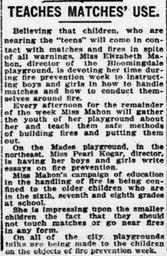 | Keywords: Article describing Elizabeth Mahon teaching about match and fire safety in Bloomingdale Playground. Original: <a href="http://chroniclingamerica.loc.gov/lccn/sn83045462/1921-10-13/ed-1/seq-2/" rel="nofollow">chroniclingamerica.loc.gov/lccn/sn83045462/1921-10-13/ed-...</a> fire safety matches mcmillanpark elizabethmahon bloomingdaleplayground |