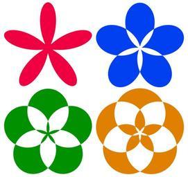 | Keywords: Mathematical-polar-equation-flowers.svg Mathematical based floral ornaments derived from the polar coordinates equation r b+sin aθ which is a slight generalization of the Limaçon and Rose curves Top left curve with a 5 and b 1 25 non-self-intersecting Top right curve with a 5/2 and b 1 08 single-level self-intersecting Bottom left curve with a 5/3 and b 1 08 two-level self-intersecting Bottom right curve with a 5/4 and b 1 08 three-level self-intersecting The self-intersecting curves are displayed with even-odd fill algorithm For other patterns made with the quasi-Limaçon/Rose equation r b+sin aθ see File Interlaced-Triangles Brunnian-link alternate svg and File Quinquetra-interlaced-alternate svg For other abstract symmetrical floral ornaments see Image Retro-flower-ornaments svg and Image Five petal flower icon svg Self-made image converted from the following four-page vector PostScript source code <pre> /A 300 396 translate 75 dup scale def/w d mul res div/th exch def th 5 mul d div/x exch def x sin ecc add th cos mul x sin ecc add th sin mul def/B 0 w moveto 1 1 360 res mul w lineto for closepath def A/d 1 def/ecc 1 25 def/res 5 def B fill showpage A/d 2 def -18 rotate/ecc 1 08 def B eofill showpage A/d 3 def 36 rotate B eofill showpage A/d 4 def 18 rotate B eofill showpage EOF</pre> 2009 AnonMoos SVG flower icons Mathematical art Graphic ornaments with transparent background Plane algebraic curves Images with PostScript source code Blue green red yellow |