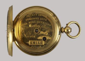 | Keywords: Mathey Peytieu - Ladies Hunting Case Watch - Walters 58287 - Back Open.jpg An 18K gold case with translucent enamel over guilloché surface revealing engraved patterns Enameled in the face of the case is a putto with flowers and on the reverse is finely engraved gold ground covered with brown transluscent enamel and set with a half-pearl between 1840 1849 gold translucent enamel over guilloché surface rose diamonds rubies half-pearl Diam 1 11/16 x D 3/8 in 4 29 x 0 95 cm accession number 58 287 35509 Rebecca Ulman Weil date of acquisition unknown by purchase Henrietta Lehmayer Moser 1898-1960 Baltimore 1936 by inheritance from her aunt Liz and Peter Moser Baltimore 1958-1959 by gift from his mother Walters Art Museum Gift of Liz and Peter Moser 2006 place of origin Le Locle Switzerland Walters Art Museum license Media contributed by the Walters Art Museum needs category review Timepieces in the Walters Art Museum Media contributed by the Walters Art Museum needs artist review Pocket watches |