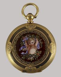 | Keywords: Mathey Peytieu - Ladies Hunting Case Watch - Walters 58287.jpg An 18K gold case with translucent enamel over guilloché surface revealing engraved patterns Enameled in the face of the case is a putto with flowers and on the reverse is finely engraved gold ground covered with brown transluscent enamel and set with a half-pearl between 1840 1849 gold translucent enamel over guilloché surface rose diamonds rubies half-pearl Diam 1 11/16 x D 3/8 in 4 29 x 0 95 cm accession number 58 287 35509 Rebecca Ulman Weil date of acquisition unknown by purchase Henrietta Lehmayer Moser 1898-1960 Baltimore 1936 by inheritance from her aunt Liz and Peter Moser Baltimore 1958-1959 by gift from his mother Walters Art Museum Gift of Liz and Peter Moser 2006 place of origin Le Locle Switzerland Walters Art Museum license Media contributed by the Walters Art Museum needs category review Timepieces in the Walters Art Museum Media contributed by the Walters Art Museum needs artist review Pocket watches |