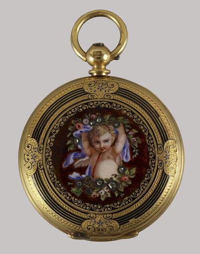 Keywords: Mathey Peytieu - Ladies Hunting Case Watch - Walters 58287.jpg An 18K gold case with translucent enamel over guilloché surface revealing engraved patterns Enameled in the face of the case is a putto with flowers and on the reverse is finely engraved gold ground covered with brown transluscent enamel and set with a half-pearl between 1840 1849 gold translucent enamel over guilloché surface rose diamonds rubies half-pearl Diam 1 11/16 x D 3/8 in 4 29 x 0 95 cm accession number 58 287 35509 Rebecca Ulman Weil date of acquisition unknown by purchase Henrietta Lehmayer Moser 1898-1960 Baltimore 1936 by inheritance from her aunt Liz and Peter Moser Baltimore 1958-1959 by gift from his mother Walters Art Museum Gift of Liz and Peter Moser 2006 place of origin Le Locle Switzerland Walters Art Museum license Media contributed by the Walters Art Museum needs category review Timepieces in the Walters Art Museum Media contributed by the Walters Art Museum needs artist review Pocket watches |