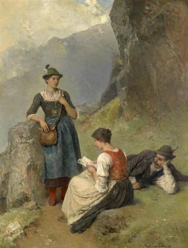 | Keywords: Mathias Schmid Die Postbotin.jpg  Die Postbotin Mathias Schmid signature oil on canvas 110 x 83 cm http //www dorotheum com Dorotheum by 1923 creator Mathias Schmid PD-old-70-1923 Images from Dorotheum Mathias Schmid People with letters in art Mail carriers in art Tracht in art Paintings of women sitting on the ground outdoors Paintings of sitting women reading outdoors |