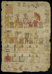 | Keywords: Matrícula de tributos - 04.tif es w es Matrícula de Tributos - Hoja 4 en The Matrícula de tributos Tribute roll records in pictographic writing the tributes that subject towns paid to Mexico-Tenochtitlan the center of the triple alliance of Mexico Tetzcoco and Tacuba in the period just before the conquest of Mexico by the Spanish The roll was very likely copied or elaborated on from a pre-Hispanic original circa 1522-30 by order of the conqueror Hernán Cortés who wanted to learn more about the economic organization of the alliance's empire Each page of the Matrícula represents one of 16 tributary provinces The main city of each province appears first at the bottom left of the page followed toward the top by the towns or altepetl subject to it Each altepetl is represented by its toponymic glyph When the left margin is full the right margin follows and finally the upper row Within this frame of toponymic glyphs the items paid by the region are represented visually in rows and the expected quantity of each item is registered using the Nahuatl system of arithmetic With its several hundred toponymic glyphs and detailed tributary record the Matrícula de tributos is a valuable document for the study of the political geography and economy of preconquest Mexico Nahuatl place names the Nahuatl numbering system and the economic wealth of the empire 2011-05-19 Imágenes obtenidas de la World Digital Library http //www wdl org/es/item/3248/ procedientes del Instituto Nacional de Antropología e Historia INAH Mexico Anónimo circa 1520 PD-old-100 Uploaded with UploadWizard Matrícula de Tributos Instituto Nacional de Antropología e Historia Images from the World Digital Library |