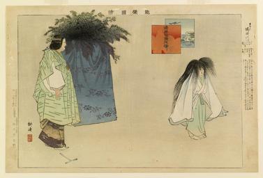 | Keywords: Matsuke Heikichi - Nogaku zue - Walters 95256.jpg Walters Art Museum artwork Creator Daikokuya Matsuki Heikichi en Crazed by grief a mother searches for her kidnapped child only to discover that he died a year earlier at the spot beside the Sumida River that she has just reached Brought to a grassy mound by a willow tree under which the child was buried she is asked by the villagers to lead their prayers to Amida Buddha While they are chanting the child repeatedly appears before her eyes Mother Is it you my child Ghost Is it you my mother Chorus And as she seeks to grasp it by the hand The shape begins to fade away; The vision fades and reappears And stronger grows her yearning Day breaks in the eastern sky The ghost has vanished; What seemed her boy Is but a grassy mound Lost on the wide desolate moor Sadness and tender pity fill all hearts Sadness and tender pity fill all hearts 1899 Meiji pigments mulberry paper cm 24 77 37 15 accession number 95 256 18557 Mr and Mrs C R Snell Jr date and mode of acquisition unknown Walters Art Museum Gift of Mr and Mrs C R Snell Jr 1989 Signature Kogyo place of origin Tokyo Japan Walters Art Museum license PD-old-auto 1927 2D Japanese prints in the Walters Art Museum Historic samurai prints Daikokuya Matsuki Heikichi Kōgyo Tsukioka |