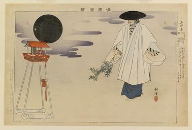| Keywords: Matsuke Heikichi - Nogaku zue - Walters 95249.jpg Walters Art Museum artwork Creator Daikokuya Matsuki Heikichi en After dreaming of its famous bell a grieving mother seeks her lost child at Mii Temple She arrives on the night of a full autumn moon wearing a traveler's hat and grasping a branch of bamboo a symbol of female frenzy In an emotion-filled dance the woman begs the priests to let her ring the bell which is represented on stage by a miniature construction At its sound the child recognizes his mother immediately 1899 Meiji pigments mulberry paper cm 25 37 2 accession number 95 249 8354 Mr and Mrs C R Snell Jr date and mode of acquisition unknown Walters Art Museum Gift of Mr and Mrs C R Snell Jr 1989 Signature Kogyo place of origin Tokyo Japan Walters Art Museum license PD-old-auto 1927 2D Japanese prints in the Walters Art Museum Historic samurai prints Daikokuya Matsuki Heikichi Kōgyo Tsukioka |