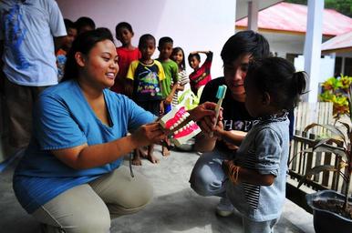 Keywords: Maureen Malingkas Demonstrates the Proper Way To Brush Your Teeth.jpg University of California San Diego Pre-Dental Society which is currently embarked with the Military Sealift Command hospital ship USNS Mercy T-AH 19 demonstrates the proper way to brush your teeth to a local Indonesian child during a medical civic action program organized by the Military Sealift Command hospital ship USNS Mercy T-AH 19 Mercy is deployed for Pacific Partnership 2010 the fifth in a series of annual U S Pacific Fleet endeavors conducted in Indonesia as a disaster relief exercise aimed at strengthening regional partnerships http //www buygoldteeth com/shop Gold Teeth U S Navy photo by Mass Communication Specialist 2nd Class Jon Husman/Released 2010-07-20 20 52 04 https //www flickr com/photos/statephotos/4830037645/ U S Department of State other versions PD-USGov United States Department of State