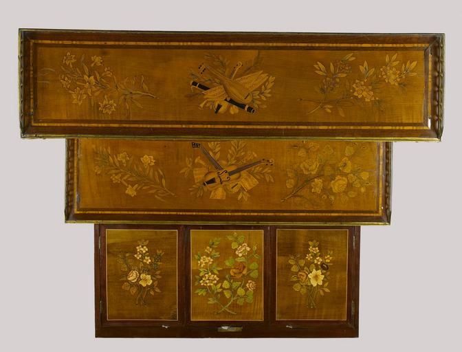 | Keywords: Maurice-Bernard Evalde - Lady's Desk - Walters 6560 - Top View A.jpg This desk bears the stamp of Evalde who became a master ébéniste or maker of inlaid furniture in 1765 He was responsible for the now lost jewel cabinet that King Louis XV of France presented to Marie-Antoinette on the occasion of her marriage to the future Louis XVI in 1770 The key to this desk bears the crown of France indicating that the piece may have been made for a member of the royal family The doors are inlaid in colored marquetry wood inlay Among the images found on the surface are a writing table and navigational instruments The desk's front drawer opens to reveal an inlaid writing surface which slides back to reveal compartments below ca 1770 oak marquetry in naturally colored and stained woods and gilded bronze cm 120 67 ; With drawers open cm 104 14 67 95 65 41 accession number 65 60 9586 La Comtesse Henri du Chastel de la Howarderie Belgium Sale Christies London December 4 1969 lot no 108 Ronald A Lee 1-9 Bruton Place London as agent Walters Art Museum 1969 by purchase Museum purchase in memory of Philip B Perlman 1969 place of origin Paris France Walters Art Museum license Maurice-Bernard Evalde Media contributed by the Walters Art Museum needs category review Furniture in the Walters Art Museum |