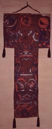 | Keywords: Mawangdui silk banner from tomb no1.jpg The painting on silk depicts the heaven upper part the human realm middle part and the netherworld bottom part Heaven Nüwa--depicted as a human with a serpent's body--is seen at the center The sun with its crow is seen at the right There are another eight suns depicted on the right The hare and toad on the moon is depicted on the left Chang'e flying towards the moon is depicted on the left A heavenly gate separating heaven and earth is depicted Dragons and guardians are depicted Human realm Xin Zhui--the deceased occupant of the tomb--is depicted traveling over the road to heaven while being accompanied by three maids of honor and welcomed by minor officials Two dragons interlocked by a jade disk are depicted Xin Zhui's family is seen offering sacrifices and prayers Netherworld Depicted here is a giant that stands on the back of whales while holding up earth Western Han period 206 BC ˆ’ 25 AD Three layers of silk<br/> One piece of silk sewn over the whole width of the center part<br/> A piece of silk sewn on each side of the upper part<br/> A bamboo stick at top wrapped by the silk<br/> Four tassels made from indigo flax thread 205 cm long<br/>92 cm wide at the top<br/>47 7 cm wide at the bottom Hunan Provincial Museum http //www hnmuseum com/hnmuseum/eng/collection/collectionContent jsp infoid 012fa0841dc9402884832f7093f210ee T-Shaped Painting on Silk 206 BC-25 AD Changsha Hunan Provincial Museum http //www hnmuseum com/hnmuseum/eng/specialExhibitions/gb/silkpic htm The T-shaped Painting on Silk Changsha Hunan Provincial Museum http //www hnmuseum com/hnmuseum/whatson/e_exhibitions/mwd/index html é©¬çŽ‹å †æ±‰å¢“é™ˆåˆ—å…¨æ™¯æ•°å—展厅 Changsha Hunan Provincial Museum object history Unearthed in 1972 <br/> At the Mawangdui Han Tomb No 1 during the evening of 25 April 1972 this T-shaped painting on silk was discovered on the coffin of the fourth layer Over the course of the following days it was carefully removed and secured for transport to the museum exhibition history A reproduction of this banner can be publicly viewed credit line This is a funeral procession banner During the Han dynasty people believed that the spirit would leave the body upon death becoming a wandering spirit The spirit was called back to the body before burial by this banner while the soul was restored by leaving the body in the coffin at home for a few days before burial to allow its return to the body The banner was placed in front the coffin and would be held up while the coffin was being carried guiding the spirit to the burial ground After the memorial ceremony the banner would be placed on top of the innermost coffin to be buried This way the spirit ascends heaven and the soul goes underground This traditional practice is still extant in some form today accession number place of creation China during the Han dynasty http //www hnmuseum com/hnmuseum/whatson/e_exhibitions/mwd/index html é©¬çŽ‹å †æ±‰å¢“é™ˆåˆ—å…¨æ™¯æ•°å—展厅 Changsha Hunan Provincial Museum <gallery> File Western Han Chinese Silk JPG Same banner File Banière funéraire peinture sur soie Chine jpg Same banner </gallery> other fields Different banner from tomb 3</gallery> PD-old-100 Silk textiles Paintings from China Mawangdui Textiles of the Western Han Dynasty Chinese silk Hunan Provincial Museum Xin Zhui Nuwa |