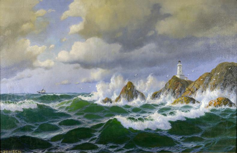 Keywords: Max Jensen - Leuchtturm auf den Klippen.jpg Leuchtturm auf den Klippen Light house on the cliffs View from the stormy sea shows the waves beating the cliffs under the lonely lighthouse oil canvas cm 70 106 http //www papilio cz/en/archiv php aukce a35 pol 13720 PHPSESSID 2eae12d28358589ce694d78e964a7a51 Zezula Auction House Max Jensen 1860   after 1908 s 1880 bottom left signed žM Jensen PD-old-100-1923 Max Jensen Oil paintings of seascapes Paintings of lighthouses Images from Zezula Auction House Waves in art