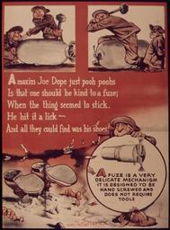 | Keywords: "A maxim Joe Dope just pooh poohs, is that one should be kind to a fuze, when the thing seemed to stick, he hit it a... - NARA - 514715.jpg Scope and content General notes 514715 Local identifier 44-PA-1143Q Office for Emergency Management Office of War Information Domestic Operations Branch Bureau of Special Services 03/09/1943 - 09/15/1945 Still Picture Records Section Special Media Archives Services Division NWCS-S National Archives at College Park 8601 Adelphi Road College Park MD 20740-6001 1941 - 1945 Record group Record Group 44 Records of the Office of Government Reports 1932 - 1947 Record group ARC 373 World War II Posters compiled 1942 - 1945 Series ARC 513498 File unit File unit ARC Variant control numbers NAIL Control Number NWDNS-44-PA-1143Q Other versions <gallery> File A_maxim_Joe_Dope_just_pooh_poohs _is_that_one_should_be_kind_to_a_fuze _when_the_thing_seemed_to_stick _he_hit_it_a _-_NARA_-_514715 tif tif File A_maxim_Joe_Dope_just_pooh_poohs _is_that_one_should_be_kind_to_a_fuze _when_the_thing_seemed_to_stick _he_hit_it_a _-_NARA_-_514715 jpg jpg </gallery> NARA-cooperation PD-USGov Safety Fuzes Bombs in art World War II posters from the United States |
