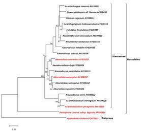 | Keywords: Maximum Likelihood-Tree-Acanthobasidium-Aleurodiscus-Neoaleurodiscus.svg Figure Evolutionary relationships of Acanthobasidium Aleurodiscus s s and Neoaleurodiscus<br/> The evolutionary history was inferred by using the Maximum Likelihood method based on the Tamura-Nei model 1 The tree with the highest log likelihood -3059 7469 is shown The percentage of trees in which the associated taxa clustered together is shown next to the branches Initial tree s for the heuristic search were obtained by applying the Neighbor-Joining method to a matrix of pairwise distances estimated using the Maximum Composite Likelihood MCL approach A discrete Gamma distribution was used to model evolutionary rate differences among sites 5 categories +G parameter 0 1542 The rate variation model allowed for some sites to be evolutionarily invariable +I 54 0453 sites The tree is drawn to scale with branch lengths measured in the number of substitutions per site The analysis involved 20 nucleotide sequences There were a total of 935 positions in the final dataset Evolutionary analyses were conducted in MEGA6 2 <br/> For all taxa the GenBank number of the DNA-sequence is shown All black sequences sequences are used bySheng-Hua Wu in his most parsimonious tree additional sequences are red 3<br/><br/> 1 Tamura K and Nei M 1993 Estimation of the number of nucleotide substitutions in the control region of mitochondrial DNA in humans and chimpanzees Molecular Biology and Evolution 10 512-526 <br/> 2 Tamura K Stecher G Peterson D Filipski A and Kumar S 2013 MEGA6 Molecular Evolutionary Genetics Analysis version 6 0 Molecular Biology and Evolution30 2725-2729 <br/> 3 Sheng-Hua Wu Dong-Mei Wang Shi-Yi Yu Neoaleurodiscus fujii a new genus and new species found at the timberline in Japan In The Mycological Society of America Hrsg Mycologia Vol 102 1 Lawrence 2010 S 217 “223<br/> ; List with GenBank Sequences http //www ncbi nlm nih gov/nuccore/AY039326 Aleurodiscus grantii strain T569 http //www ncbi nlm nih gov/nuccore/AY039312 Aleurodiscus amorphus strain HHB15282 http //www ncbi nlm nih gov/nuccore/AF506397 Aleurodiscus amorphus - AF506397 http //www ncbi nlm nih gov/nuccore/AY039315 Acanthobasicium penicillatum strain T322 http //www ncbi nlm nih gov/nuccore/AY039322 Aleurodiscus weirii strain HHB12678 http //www ncbi nlm nih gov/nuccore/AY039328 Acanthobasidium norvegicum strain T623 http //www ncbi nlm nih gov/nuccore/AY039317 Acanthobasidium aurantius strain T621 http //www ncbi nlm nih gov/nuccore/FJ799924 Neoaleurodiscus fujii strain Wu0807-41 http //www ncbi nlm nih gov/nuccore/AY039333 Acanthofungus rimosus AY039333 http //www ncbi nlm nih gov/nuccore/AY039311 Stereum rugosum AY039311 http //www ncbi nlm nih gov/nuccore/AY039319 Acanthophysium lividocaeruleum AY039319 http //www ncbi nlm nih gov/nuccore/AY039307 Xylobolus frustulatus AY039307 http //www ncbi nlm nih gov/nuccore/AY039310 Acanthophysium cerussatum AY039310 http //www ncbi nlm nih gov/nuccore/AY039331 Aleurobotrys botryosus AY039331 http //www ncbi nlm nih gov/nuccore/AF506438 Gloeocystidiopsis aff flamma AF506438 http //www ncbi nlm nih gov/nuccore/AY039332 Aleurodiscus mirabilis AY039332 http //www ncbi nlm nih gov/nuccore/AY039306 Aleurodiscus oakesii AY039306 http //www ncbi nlm nih gov/nuccore/AF506424 Peniophora cinerea subsp fagicola AF506424 http //www ncbi nlm nih gov/nuccore/AY039305 Acanthobasidium phragmitis AY039305 http //www ncbi nlm nih gov/nuccore/DQ873603 Hyphodontia alutaria DQ873603 own 2014-08-19 Thkgk Cc-zero Acanthobasidium Aleurodiscus penicillatus Aleurodiscus Neoaleurodiscus |