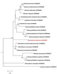 | Keywords: Maximum Likelihood -Tree-of-Aleurobotrys and related Taxa.svg Figure Figure Molecular Phylogenetic analysis of Aleurobotrys and related Taxa by Maximum Likelihood method <br/> The evolutionary history was inferred by using the Maximum Likelihood method based on the Kimura 2-parameter model 1 The tree with the highest log likelihood -3361 7056 is shown The percentage of trees in which the associated taxa clustered together is shown next to the branches A user-specified tree was used as an initial tree in the heuristic search A discrete Gamma distribution was used to model evolutionary rate differences among sites 5 categories +G parameter 0 5290 The rate variation model allowed for some sites to be evolutionarily invariable +I 69 0768 sites The tree is drawn to scale with branch lengths measured in the number of substitutions per site The analysis involved 20 nucleotide sequences All positions with less than 95 site coverage were eliminated That is fewer than 5 alignment gaps missing data and ambiguous bases were allowed at any position There were a total of 1171 positions in the final dataset Evolutionary analyses were conducted in http //megasoftware net/ MEGA6 2<br/> 1 Kimura M 1980 A simple method for estimating evolutionary rate of base substitutions through comparative studies of nucleotide sequences Journal of Molecular Evolution 16 111-120 <br/> 2 Tamura K Stecher G Peterson D Filipski A and Kumar S 2013 MEGA6 Molecular Evolutionary Genetics Analysis version 6 0 Molecular Biology and Evolution30 2725-2729 <br/> ; List with GenBank Sequences http //www ncbi nlm nih gov/nuccore/AF506479 Stereum hirsutum AF506479 http //www ncbi nlm nih gov/nuccore/AF506482 Stereum subtomentosum AF506482 http //www ncbi nlm nih gov/nuccore/AF506480 Stereum reflexulum AF506480 http //www ncbi nlm nih gov/nuccore/AF506481 Stereum rugosum AF506481 http //www ncbi nlm nih gov/nuccore/AF506400 Aleurodiscus lividocoeruleus AF506400 http //www ncbi nlm nih gov/nuccore/AF506491 Xylobolus frustulatus AF506491 http //www ncbi nlm nih gov/nuccore/AF506382 Conferticium ravum AF506382 http //www ncbi nlm nih gov/nuccore/AF506381 Gloeocystidiellum heimii AF506381 http //www ncbi nlm nih gov/nuccore/AF506442 Gloeocystidiellum triste AF506442 http //www ncbi nlm nih gov/nuccore/AF506438 Gloeocystidiopsis aff flamma AF506438 http //www ncbi nlm nih gov/nuccore/AF506437 Gloeocystidiopsis flammea AF506437 http //www ncbi nlm nih gov/nuccore/AF506398 Aleurobotrys botryosus AF506398 http //www ncbi nlm nih gov/nuccore/AF506401 Aleurodiscus dextrinoideocerussatus AF506401 http //www ncbi nlm nih gov/nuccore/AF506399 Aleurodiscus cerussatus AF506399 http //www ncbi nlm nih gov/nuccore/AF506448 Gloeomyces graminicola AF506448 http //www ncbi nlm nih gov/nuccore/AF506377 Boidinia macrospora AF506377 http //www ncbi nlm nih gov/nuccore/AF506432 Gloeocystidiellum aspellum AF506432 http //www ncbi nlm nih gov/nuccore/AF506434 Gloeocystidiellum compactum AF506434 http //www ncbi nlm nih gov/nuccore/AF506397 Aleurodiscus amorphus AF506397 http //www ncbi nlm nih gov/nuccore/AF506414 Lactarius volemus AF506414 own 2014-09-01 Thkgk Cc-zero Aleurobotrys botryosus Stereaceae |