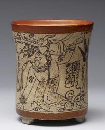| Keywords: Mayan - Cylinder Vessel - Walters 482776 - Side D.jpg The painted vases of the Maya offer a window on a lost world The black-on-cream coloring seen here is often referred to as codex-style because of its resemblance to ancient Maya books or codices all but four of which have been lost or destroyed Here three seated supernatural figures converse about a sacrificial ritual indicated by the trident-shaped blade held by the most rotund one Hieroglyphic texts name the characters the figure with a sombrero-like hat and insect wings is Mok Chi' perhaps the patron deity of beekeepers The three may represent different aspects of the deity art historians call God A-prime associated with sacrifice and self-decapitation between 600 900 Late Classic buff earthenware with black and red slip cm 16 13 3 h x diam accession number 48 2776 20005 George and Julianne Alderman date and mode of acquisition unknown Walters Art Museum Gift of George and Julianne Alderman 2005 place of origin Guatemala Walters Art Museum license Maya art in the Walters Art Museum Maya codex vases |