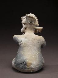 | Keywords: Mayan - Dwarf Figurine - Walters 20092036 - Back.jpg Dwarfs were important members of royal Maya courts They are portrayed serving food playing musical instruments holding sacred objects for the ruler and as diviners and scribes Their elevated social roles were steeped in cosmology and religious mythology especially that of the maize god who was assisted by a dwarf when the deity set the Three Stones of the cosmic hearth at the beginning of Creation The Classic Maya viewed dwarfs as the living embodiment of the maize god's supernatural helpers who continued their sacred duty in the regal court Maya peoples today believe that earlier creations were populated by a race of dwarfs who now reside inside the earth living below the ruins of the ancient cities The ornate turban worn by this dwarf is typical of the courtly garb of key individuals serving the ruler This so-called spangled turban headdress is especially connected to gods and humans associated with Creation and scribal duties A curious feature of this dwarf is what may be a halved cacao pod held in his right hand His cheeks are covered with what appears to be a thin woven fabric; this recalls other figurines many of which are dwarfs with an unidentifiable material plastered to the lower half of their face These features suggest the depiction of a formal rite The graceful rendering of this figure and the exceptional attention to detail reveal the work of a master artist AD 550-850 Late Classic earthenware post-fire paint cm 20 32 12 7 15 88 accession number 2009 20 36 80191 J Guy Puerto date and mode of acquisition unknown John G Bourne 1960s by purchase Walters Art Museum Gift of John Bourne 2009 place of origin Campeche Mexico Walters Art Museum license Maya art in the Walters Art Museum Maya ceramic figurines Media contributed by the Walters Art Museum needs category review |