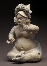 | Keywords: Mayan - Dwarf Figurine - Walters 20092036 - View A.jpg Dwarfs were important members of royal Maya courts They are portrayed serving food playing musical instruments holding sacred objects for the ruler and as diviners and scribes Their elevated social roles were steeped in cosmology and religious mythology especially that of the maize god who was assisted by a dwarf when the deity set the Three Stones of the cosmic hearth at the beginning of Creation The Classic Maya viewed dwarfs as the living embodiment of the maize god's supernatural helpers who continued their sacred duty in the regal court Maya peoples today believe that earlier creations were populated by a race of dwarfs who now reside inside the earth living below the ruins of the ancient cities The ornate turban worn by this dwarf is typical of the courtly garb of key individuals serving the ruler This so-called spangled turban headdress is especially connected to gods and humans associated with Creation and scribal duties A curious feature of this dwarf is what may be a halved cacao pod held in his right hand His cheeks are covered with what appears to be a thin woven fabric; this recalls other figurines many of which are dwarfs with an unidentifiable material plastered to the lower half of their face These features suggest the depiction of a formal rite The graceful rendering of this figure and the exceptional attention to detail reveal the work of a master artist AD 550-850 Late Classic earthenware post-fire paint cm 20 32 12 7 15 88 accession number 2009 20 36 80191 J Guy Puerto date and mode of acquisition unknown John G Bourne 1960s by purchase Walters Art Museum Gift of John Bourne 2009 place of origin Campeche Mexico Walters Art Museum license Maya art in the Walters Art Museum Maya ceramic figurines Media contributed by the Walters Art Museum needs category review |