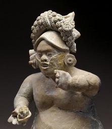 | Keywords: Mayan - Dwarf Figurine - Walters 20092036 - Detail A.jpg Dwarfs were important members of royal Maya courts They are portrayed serving food playing musical instruments holding sacred objects for the ruler and as diviners and scribes Their elevated social roles were steeped in cosmology and religious mythology especially that of the maize god who was assisted by a dwarf when the deity set the Three Stones of the cosmic hearth at the beginning of Creation The Classic Maya viewed dwarfs as the living embodiment of the maize god's supernatural helpers who continued their sacred duty in the regal court Maya peoples today believe that earlier creations were populated by a race of dwarfs who now reside inside the earth living below the ruins of the ancient cities The ornate turban worn by this dwarf is typical of the courtly garb of key individuals serving the ruler This so-called spangled turban headdress is especially connected to gods and humans associated with Creation and scribal duties A curious feature of this dwarf is what may be a halved cacao pod held in his right hand His cheeks are covered with what appears to be a thin woven fabric; this recalls other figurines many of which are dwarfs with an unidentifiable material plastered to the lower half of their face These features suggest the depiction of a formal rite The graceful rendering of this figure and the exceptional attention to detail reveal the work of a master artist AD 550-850 Late Classic earthenware post-fire paint cm 20 32 12 7 15 88 accession number 2009 20 36 80191 J Guy Puerto date and mode of acquisition unknown John G Bourne 1960s by purchase Walters Art Museum Gift of John Bourne 2009 place of origin Campeche Mexico Walters Art Museum license Maya art in the Walters Art Museum Maya ceramic figurines Media contributed by the Walters Art Museum needs category review |