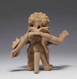 | Keywords: Mayan - Standing Figure with a Tied-Rope Pectoral - Walters 482782 - Back.jpg Although several examples of this type of figurine have come to light in recent years little is known about their function or subject matter As is typical of the known examples this piece is made from pressing clay into molds one each for the body head pectoral and costuming details The resulting parts are subsequently assembled The dotted pattern on the figure's legs is reminiscent of other Mesoamerican renditions of flayed skin which was occasionally worn in ritual events associated with fertility Like a seed or an ear of maize life exists within a dead husk when such a costume was worn and it thus references the pan-American connection between life and re-birth The oversized pectoral consisting of multiple strands of thick rope is a common feature to this type of figurine It has been associated both with rulers and with warriors yet its meaning remains poorly understood It is incorporated into Late Classic Maya art at sites nearest to Veracruz likely reflecting more intensive interaction between these two areas at this time between 600 900 Late Classic buff clay cm 14 61 accession number 48 2782 76591 Thomas D Slater until June 2005 Austen-Stokes Ancient Americas Foundation John Stokes as agent June 16 2005 by purchase Arte Primitivo New York as agent Walters Art Museum Gift of the Austen-Stokes Ancient Americas Foundation 2007 place of origin Remojadas in present-day Veracruz Mexico Walters Art Museum license Maya art in the Walters Art Museum Maya ceramic figurines Media contributed by the Walters Art Museum needs category review |