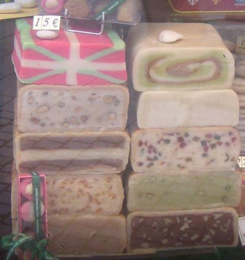 | Keywords: Mazapán vasco.jpg en Beautiful coloured marzipans in North Euskadi including one in the form of the Basque flag ca Al País Basc nord es vénen unes barretes petites de 10 a 15 cm de llarg i 1 cm de fruix de massapà tenyit en colors diversos Es produeixen durant tot l'any i són considerades una de les especialitats de la regió De vegades estan decorades amb alguns trossos de fruita seca o confitada Li'n diuen touron el que fa que molts francesos pensin que això és el torró alicantí i que es menja com a postres tot l'any De fet ells els vénen sobretot als turistes francesos que hi van al juliol i a l'agost i el model amb més sortida és el de la bandera basca Aquesta foto està presa a l'agost a Biarritz fr Pâte à massepain paintée et vendu comme torró or turrón aux touristes français own Slastic 2009-08 Food of the Basque Country Marzipan |