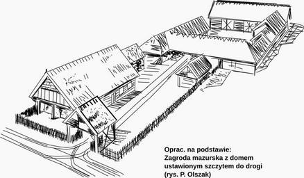 Keywords: Mazurska wies.svg pl Oprac na podstawie Zagroda mazurska z domem ustawionym szczytem do drogi rys P Olszak own Telewizjamsi 2008 Farmhouses in Mazury Courtyard farms Masurians