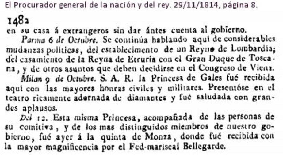 | Keywords: MB-Monza-1814-ricevimento-Pincipessa-del-Galles.jpg it Ricevimento in Villa Reale a Monza dato dal feldmaresciallo Bellegarde in onore della Principessa del Galles in visita a Milano El Procurador general de la nacion y del rey 29 11 1814 pag 8 author 1814-11-29 100px thumb right it Traduzione in italiano dallo spagnolo Milano 9 ottobre 1814 S A R la Principessa del Galles fu ricevuta qui con i massimi onori civili e militari Si presentò in teatro della Scala riccamente adorna di diamanti e fu salutata con grandi applausi Del 12 Questa stessa Principessa accompagnata dalle persone del suo seguito e dai più distinti membri del nostro governo fu ieri alla Villa di Monza dove fu ricevuta con la massima magnificenza dal Feldmaresciallo https //it wikipedia org/wiki/Heinrich_Johann_Bellegarde uselang it Bellegarde PD-old-100 ImageNote 1 5 106 401 122 413 229 2 Traduzione in italiano dallo spagnolo Milano 9 ottobre 1814 S A R la Principessa del Galles fu ricevuta qui con i massimi onori civili e militari Si presentò in teatro della Scala riccamente adorna di diamanti e fu salutata con grandi applausi Del 12 Questa stessa Principessa accompagnata dalle persone del suo seguito e dai più distinti membri del nostro governo fu ieri alla Villa di Monza dove fu ricevuta con la massima magnificenza dal Feldmaresciallo https //it wikipedia org/wiki/Heinrich_Johann_Bellegarde uselang it Bellegarde ImageNoteEnd 1 History of Monza Monza in the 1810s Heinrich Bellegarde Princess Charlotte Augusta of Wales 1814 in Italy |