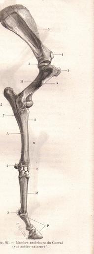 Keywords: MbreAntChevalChauveau1980.jpg en Antero-external view of the anterior limb of a horse Equus caballus fr Vue antéro-externe d'un membre antérieur de cheval Equus caballus <br /> O scapula omoplate Scapula <br /> H humérus Humerus <br /> A les os de l'avant-bras Skeleton antebrachi <br /> C carpe Carpus basipode de la main <br /> M métacarpe Metacarpus métapode de la main <br /> P phalanges Phalanx acropode de la main <br /> S grands sésamoïdes Ossa sesamoidea phalangis proximalis <br /> 1 processus coracoïde ou apophyse coracoïde Processus coracoideus <br /> 2 tête de l'humérus Caput humeri <br /> 3 tubercule majeur trochiter Tuberculum majus <br /> 4 tubérosité deltoïdenne empreinte deltoïdenne Tuberositas deltoidea <br /> 5 trochlée Trochlea humeri et capitulum ou condyle Capitulum humeri formant la surface articulaire inférieure de l'humérus <br /> 6 olécrâne Olecranon <br /> 7 ulna cubitus Ulna <br /> 8 radius Radius <br /> 9 os pisiforme ou sus-carpien ou accessoire Os pisiforme <br /> ” Chauveau Auguste Arloing Saturnin Traité d'anatomie comparée des animaux domestiques 1 064 p page 161 1890 Paris Lib J B Baillière et Fils domaine public décès des auteurs 1917 et 1911 Meyer C 2011-03-12 PD-old Horse leg bones Ulna Radius bone |