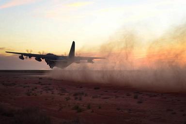 Keywords: Dusty roads Leaving trail dust wake MC-130J Commando II takes off air force aircraft