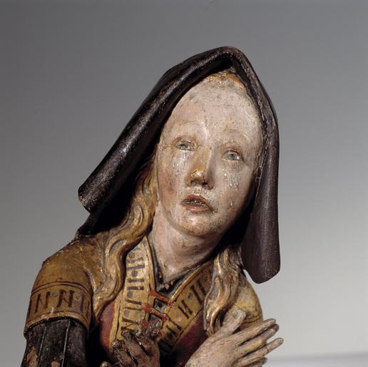 | Keywords: MCC-40223 Geknielde Maria Magdalena en staande vrouw, beiden wenend omhoog kijkend (2).tif Artwork nl Anonymous Brussel nl De achterste vrouw is in driekwart de voorste en profil naar links weergegeven op een oplopende bodem die met parallelle groeven van ca 0 5 cm breed is aangeduid Beide vrouwen kijken met betraand gezicht omhoog De voorste vrouw Maria Magdalena is op haar linkerknie neergezonken Haar linkerarm hangt naar beneden haar rechter nu afgebroken was wellicht opgeheven Zij draagt een naar boven toe uitlopend hoofddeksel bedekt met een doek Het hoofddeksel is langs boven- en onderrand versierd met een reeks parels De onderste reeks is gevat tussen twee platte banden de bovenste is begrensd door een plat bandje aan de bovenzijde en een bredere puntig getande rand aan de onderzijde Aan de voorzijde van het hoofddeksel is een bloem aangebracht met hulst-achtige blaadjes De uiteinden van de doek komen aan weerszijden samen in een braam-achtige bol waaruit een gedraaid koordje met kwastje ontspringt Vanonder de doek komen lange golvende haarstrengen die over schouders en rug van de vrouw hangen De vrouw draagt een lang bovenkleed met korte mouwen dat tot over haar voeten valt en de grond rondom haar bedekt Als gordel draagt zij een geknoopte doek De korte mouwen van het kleed zijn omgeslagen en gedecoreerd met een rand geparelde kepers tussen platte banden Ook langs de halsboord een parelrand tussen platte banden zie ook beschrijving polychromie Van het onderkleed of hemd is bij de halsboord een randje zichtbaar en onder de korte mouw een lange breed uitlopende mouw met versierde boord De achterste vrouw heeft haar handen kruislings op de borst gelegd Haar linkerbeen is iets gebogen Op haar hoofd draagt ze een muts met brede omgeslagen rand en langs haar rug afhangende punt Over haar rechterschouder ligt een lange golvende haarstreng De vrouw draagt een onderkleed met overslagboord en mouwen met door knoopjes gesloten manchetten Hieroverheen een kleed met korte mouwen dat op de borst is dichtgeregen De boorden van het bovenste deel van het kleed zijn versierd zie polychromie Het onderste deel van het kleed is een aangerimpelde strook met versierde onderrand Om haar middel een doek met knoop met aan de bovenzijde een lus aan de onderzijde twee slippen Haar linkervoet met kous en trip komt onder haar kleed uit Op de zoom van het bovenkleed van de voorste vrouw zijn letters aangebracht gescheiden door grote ingeponste punten Naast I-s zijn onder andere midden voor de letters B en N zichtbaar Op de boorden van de mouwen van het overkleed van de achterste vrouw zijn naast I-s op haar rechtermouw de letter N en op haar linkermouw de letter R leesbaar De sculptuur is voorzien van een rijke oorspronkelijke polychromie en vergulding met ponspatronen en decoratieve randen en letters in rood De polychromie is aangebracht op een dunne witte grond de vergulding en verzilvering daarenboven op een lichtrode bolus Polychromie van de voorste vrouw Incarnaat verlopend van lichtroze naar donkerroze op neus wangen en kin Wenkbrauwen dunne roodbruine lijnen; oogleden dunne rode lijnen; ogen bruin en zwart; neusvleugels roodgerand; lippen rood waarover donkerrood; tranen blauw wit gehoogd Haar verguld Hoofddeksel groenluster op zilver Dit groenluster op zilver is vooral aan de achterzijde nog goed herkenbaar De parels van de parelrandjes zijn afwisselend groen- en roodluster Het nog bewaarde koordje is gedraaid uit gouden en zwarte strengen De doek van de hoofdtooi is verguld met op de bovenzijde roodluster in strepen Op de zijkanten van de doek lijken patronen aangebracht in goud op een rode grond Halsdoek of rand onderkleed groenluster op zilver Mouw onderkleed groenluster op zilver; boord verguld met schuine rode strepen gescheiden door ingeponste punten Deze decoratie langs de boven- en onderzijde begrensd door een rode lijn Bovenkleed verguld; parelrand langs de halsboord roodluster op goud of zilver De parelrand is begrensd door twee platte bandjes Daaronder een rij punten gescheiden door roodluster streepjes De onderafsluiting van de boord is een roodluster lijn De omgeslagen rand van de mouw van het overkleed is gedecoreerd met roodluster geparelde kepers Langs de onderrand van boven naar onderen een dubbele rode lijn een reeks ingeponste puntjes letters in roodluster gescheiden door ingeponste punten een enkele rode lijn Gordel groenluster op zilver Polychromie achterste vrouw Incarnaat verlopend van lichtroze naar donkerroze op neus kin en wangen Wenkbrauwen een dubbele rode lijn; bovenste ooglid dunne rode lijn; ogen bruin met zwart en wit; tranen blauw wit gehoogd; mond lichtrood waarover donkerrood; neusvleugels rood gelijnd; tanden wit en zwart; haar verguld; handen lichtroze met witte nagels Kap zwart Onderkleed groenluster op zilver Bovenkleed bovenstuk en aangerimpelde rand verguld rok rood; koord roodluster; mouwen brokaatpatronen in roodluster; mouwboorden met letters in roodluster tussen ingeponste punten aan de bovenzijde begrensd door een dubbele aan de onderzijde door een enkele rode lijn; boorden bovenstuk dubbele roodluster I-s gescheiden door ingeponste punten en aan boven- en onderzijde begrensd door een enkele rode lijn De zoom van de aangerimpelde rand heeft eenzelfde decoratie als die van het bovenkleed van de voorste vrouw Gordel verguld Trip rood Kous zwart Bodem groenluster op zilver Vooral nog goed zichtbaar voor de voorste vrouw Op de achterzijde vage lijnen in zwarte verf Techniek Werkblok naar de zijkant taps toelopend stuk eiken; de kern ligt voor het beeld; aan de achterzijde vlak met hier en daar een vaag horizontaal zaag- spoor Rechter zijkant afgeschuind Hierin een ca 3 cm diep rond gat van ca 2 cm doorsnede Linker zijkant afgespleten In het midden van de achterzijde een rond gat van ca 2 cm doorsnede en ca 5 cm diep Standvlak wat kleine spijkergaatjes Staat Rechterhand achterste vrouw los ingepend en recent gelijmd glimmende lijmsporen aan de binnen